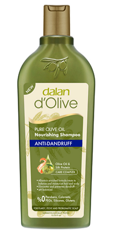 Шампунь против перхоти для всех типов волос Dalan d'Olive Anti-Dandruff Shampoo с оливковым маслом и Гидролизованным протеином Шелка, 400ml. Наш шампунь со средиземноморским оливковым маслом и протеинами шёлка эффективно помогает предотвратить появление перхоти, благодаря своей двойной системе действия: - Аллантоин, входящий в состав шампуня, превосходно увлажняет кожу головы и обеспечивает сбалансированный уход за волосами. - Насыщенный активный комплекс помогает предотвратить выпадение волос. Протеины шёлка придают мягкость Вашим волосам. Регулярное использование шампуня помогает предотвратить повторное появление перхоти. Шампунь протестирован и одобрен дерматологами, подходит для частого применения.