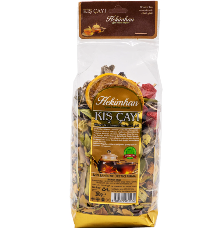 Замечательный турецкий зимний чай HEKIMHAN KIS CAYI. Чай очень насыщенный, с ароматом восточных трав, специй и пряностей. Согревающий, полезный - то, что нужно в холодное время года. Набор трав в чае содержит множество натуральных микроэлементов и полезных веществ, которые дарит нам сама природа. Входящие в состав травы, как: гранат, ромашка, гибискус, эвкалипта листья, шиповник, яблоко, лимон, шалфея трава, цедра апельсина, липа цвет, мирт не только обогащают напиток витаминами, но и делают его изысканнее. Компания HEKIMHAN BITKISEL производит продукты на основе лекарственных трав, уделяя первоочередное внимание здоровью человека, имеет сертификаты качества и производит натуральные и не содержащие добавок здоровые продукты в соответствии со стандартами.