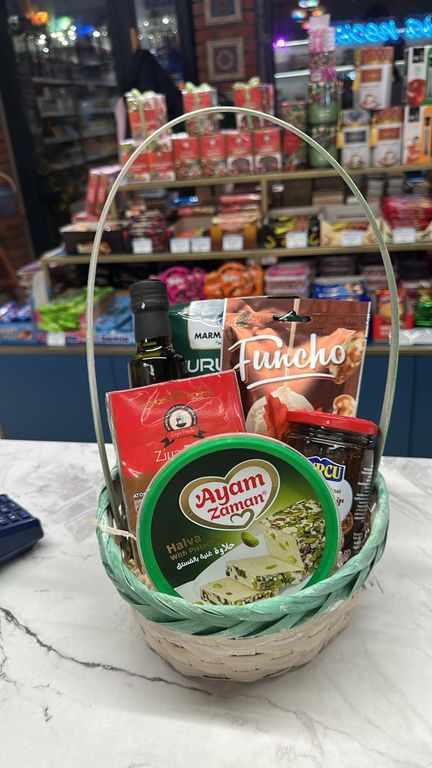 Подарочная корзина 17 на новый год 2500 руб. В корзину Состав: вяленые маслины с косточкой оливковое масло грецкий орех в капучино султан чай в кубиках варенье из инжира кунжутная халва с фисташками Состав: вяленые маслины с косточкой оливковое масло грецкий орех в капучино султан чай в кубиках варенье из инжира кунжутная халва с фисташками