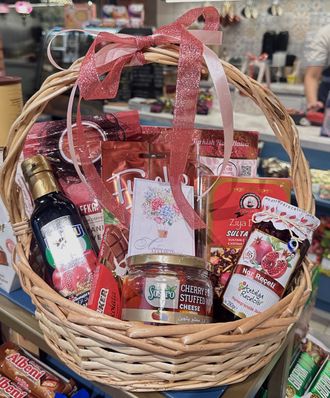 Подарочная корзина 19 на День матери 3710 руб. В корзину Состав: пишмание с розой кофе по-османски клубника в шоколаде султан чай в кубиках гранатовый соус без сахара варенье из граната перчики черри фаршированные сыром молочный шоколад ulker Состав: пишмание с розой кофе по-османски клубника в шоколаде султан чай в кубиках гранатовый соус без сахара варенье из граната перчики черри фаршированные сыром молочный шоколад ulker